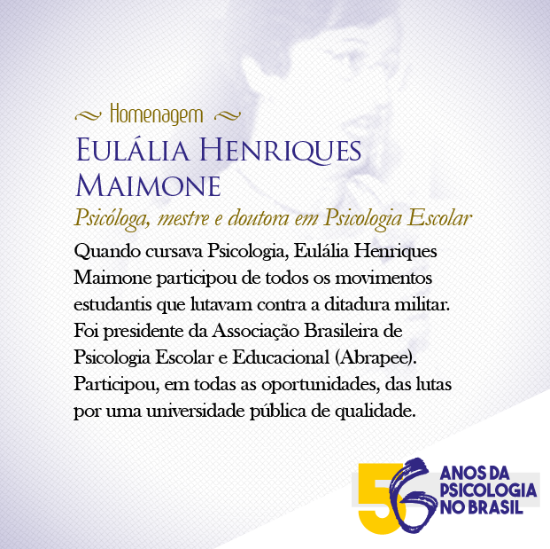 Eulália Henriques Maimone é da geração de 1964-1968 e, quando cursava Psicologia, participou de todos os movimentos estudantis da União Estadual dos Estudantes (UEE) de São Paulo e da União Nacional dos Estudantes (UNE), que lutavam contra a cátedra vitalícia nas universidades e contra a ditadura militar. Fez parte da Juventude Universitária Católica (JUC) e do Movimento de Revolução Brasileira. Como professora universitária, abraçou a causa da Psicologia Escolar, atuando em Programas de Psicologia Escolar, por meio do ensino (supervisão de estágio) e da extensão em escolas públicas de periferia e ambulatórios.