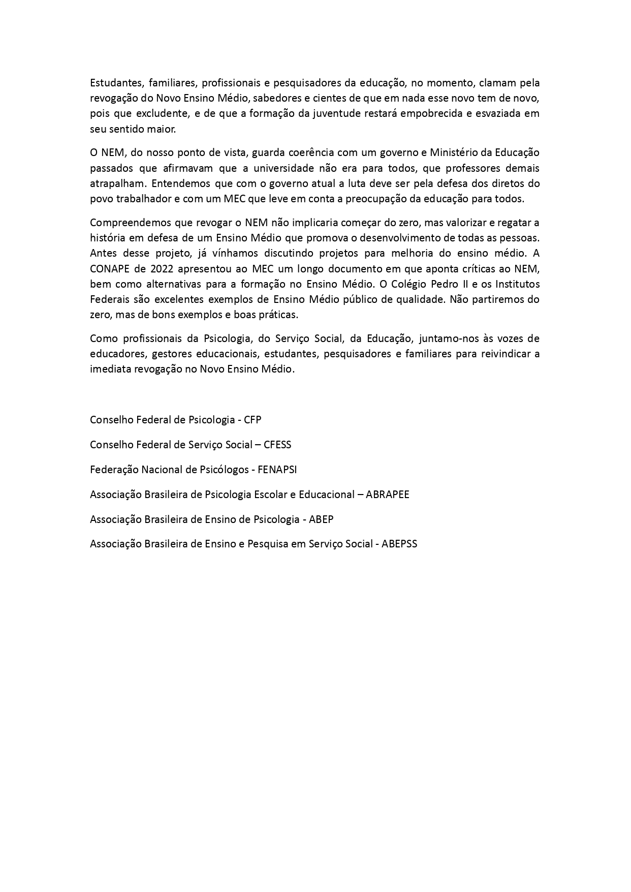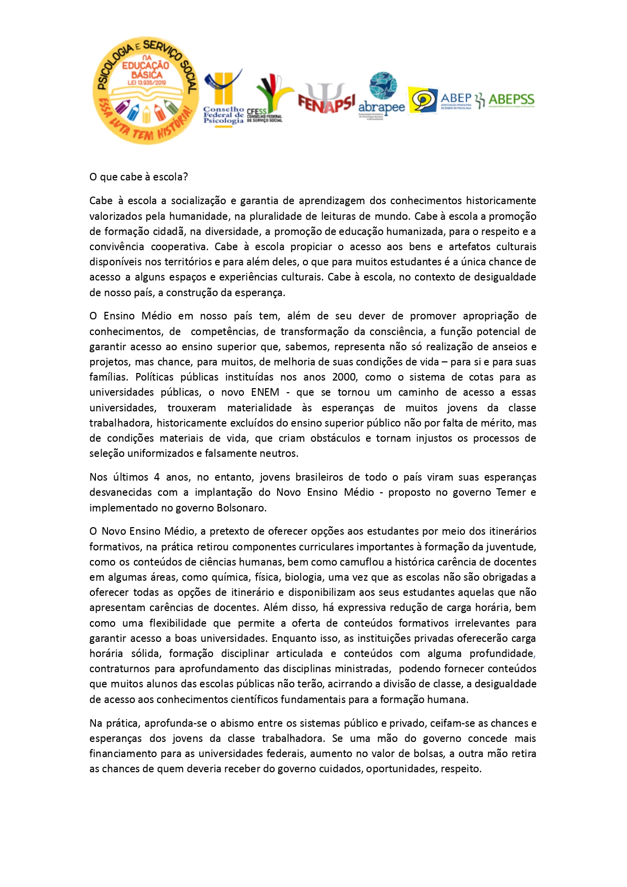 Entidades da Psicologia e do Serviço Social se posicionam para reivindicar a imediata revogação no Novo Ensino Médio